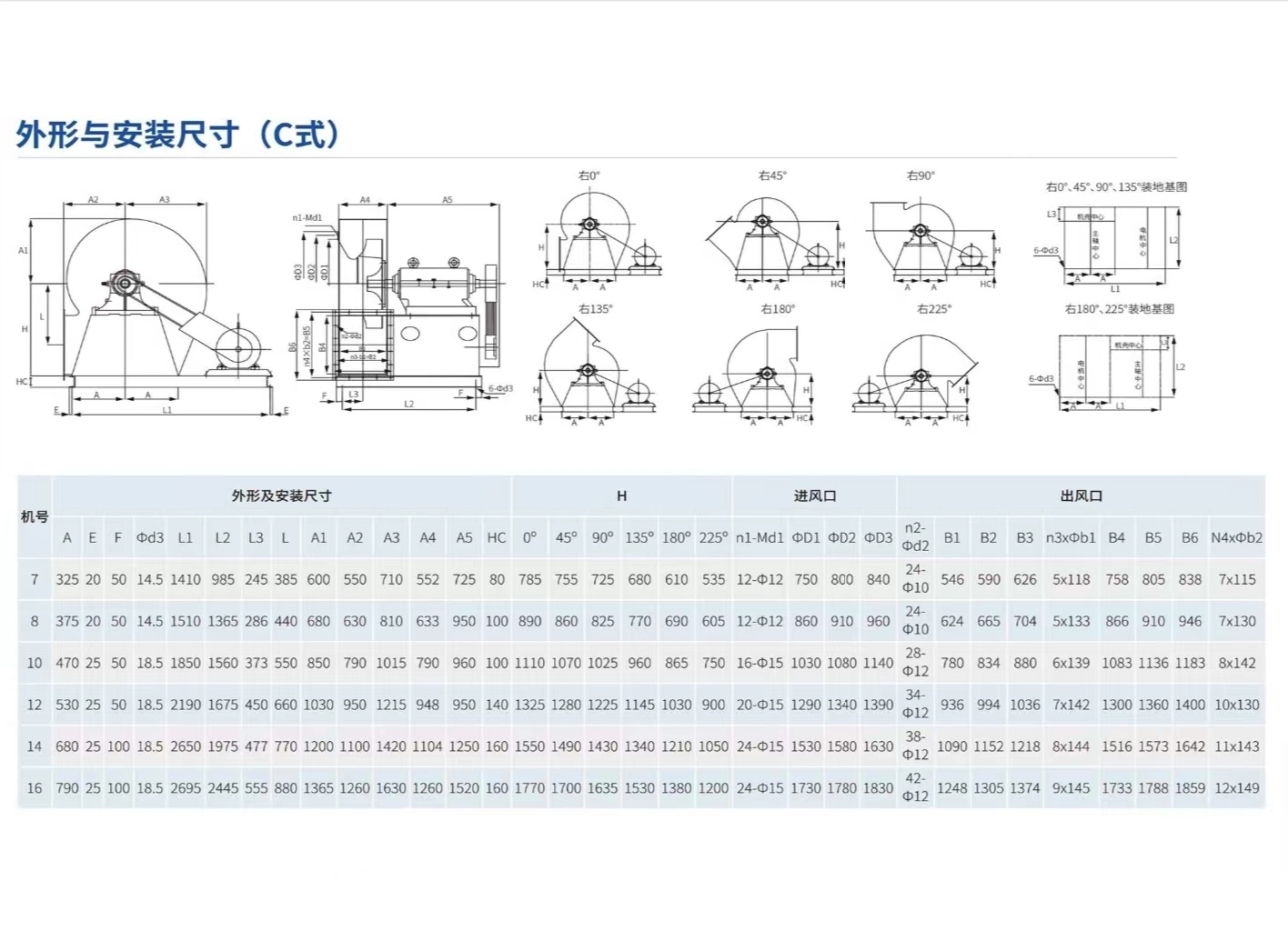 ?機(jī)的出口位置,以機(jī)殼的出?口?度表示。Ne了~6. 3在出廠時均做成一種型式,使 用單位根據(jù)要求再安裝成需要的位置,訂貨時不需注明;N9了~4. 5的 出?口位置調(diào)整范圍為0°~225°、間隔是45°.Ne5~6.3的出?口位置調(diào)整范圍為0°~225°間隔是22.5°? Ne3~6.3的傳 動方式為A式,Ne7~ 8的傳動方式為C式。N97~20的出?口位置制成定的三種,0° 90° 180° 不能調(diào)整,訂貨時須注意,N910~20的傳動式方為C式,Ne10 °20的雙進(jìn)?型式的制成出?口 位置固定的三種:0°、90°、180°, 傳動方式為C式傳動,訂貨時需注明。